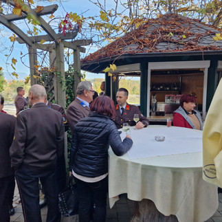 Der Tag begann um 9:00 Uhr mit einer Heiligen Messe in der Stationskaplanei Hönigtal, zu der alle in ihrer Dienstbekleidung/Ausgehuniform erschienen. Die Messe war schön gestaltet und bot den Teilnehmern einen würdevollen Rahmen für gemeinsames Innehalten und das Gedenken an verstorbene Kameraden. Nach dem Gottesdienst trafen sich die Teilnehmer zur Agape vor der Kirche, wo erste gesellige Gespräche bei kleinen Erfrischungen geführt wurden.