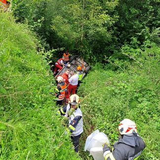 Am Einsatzort stellte sich nach Erkundung durch den Einsatzleiter heraus, dass eine Person in dem verunfallten Fahrzeug eingeklemmt war. Außerdem befand sich der havarierte PKW in einem abschüssigen Straßengraben und war daher nur schwer zugänglich.